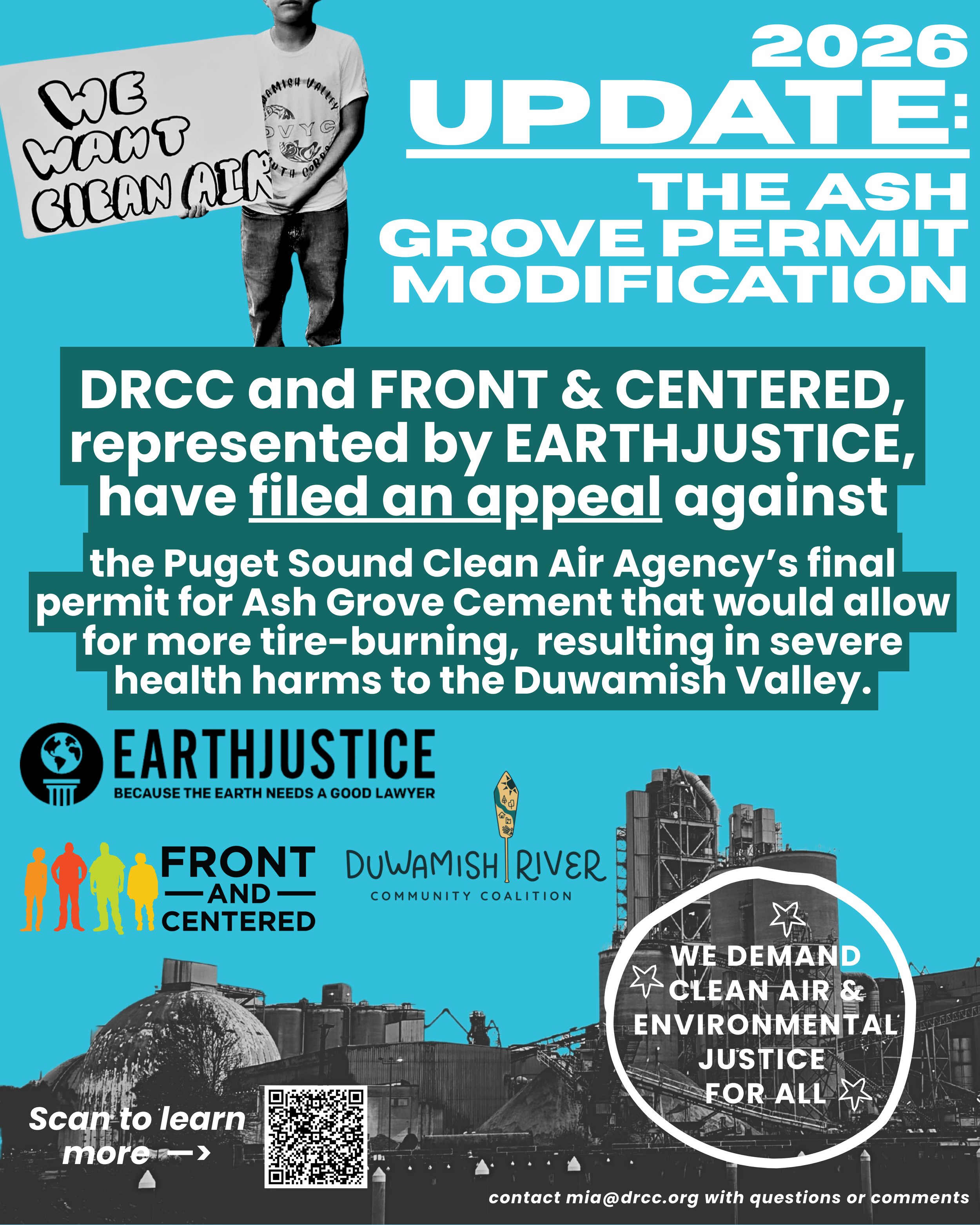 On December 5th, 2025, despite overwhelming community opposition, the Puget Sound Clean Air Agency (PSCAA) issued a Final Notice of Construction and Air Operating Permit for the Ash Grove Cement Company. This permit would allow Ash Grove to burn more tires to heat their kilns and would expose Duwamish Valley residents to dangerous levels of health-harming air pollution.