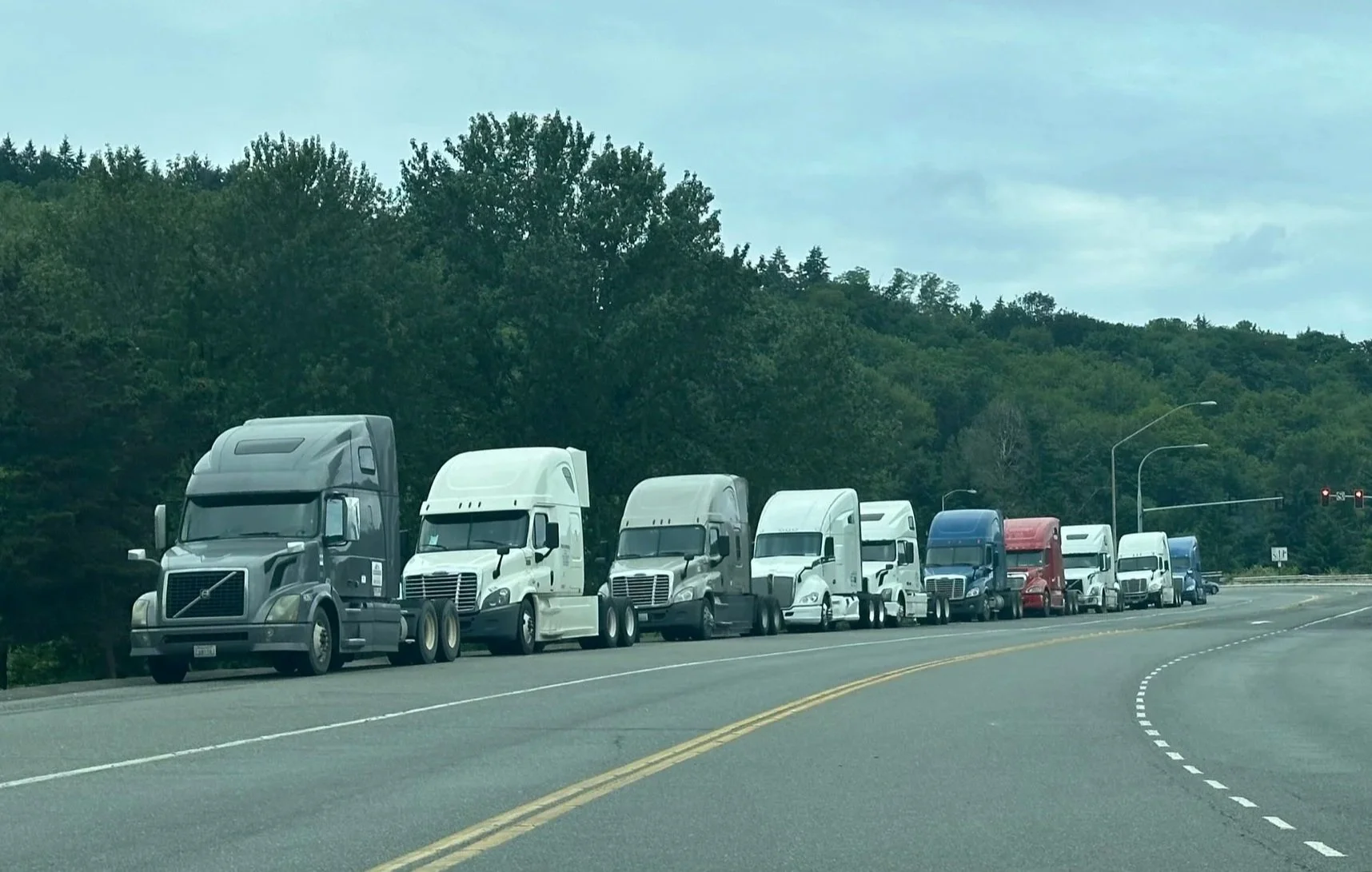 Idling drayage trucks on the roadway in the Duwamish Valley